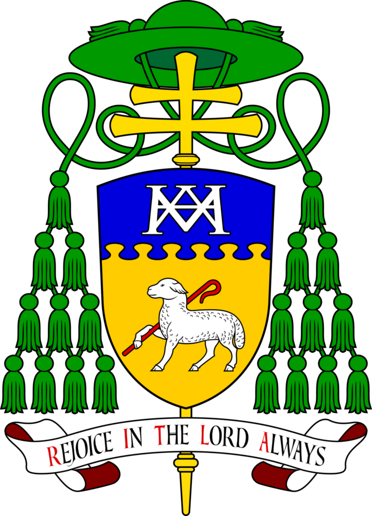 On a scroll below the shield is Archbishop Martin’s motto: Rejoice in the Lord always. (Philippians 4:4), which echoes the response of Mary in the Magnificat when she exclaimed, “my spirit rejoices in God my Saviour.”